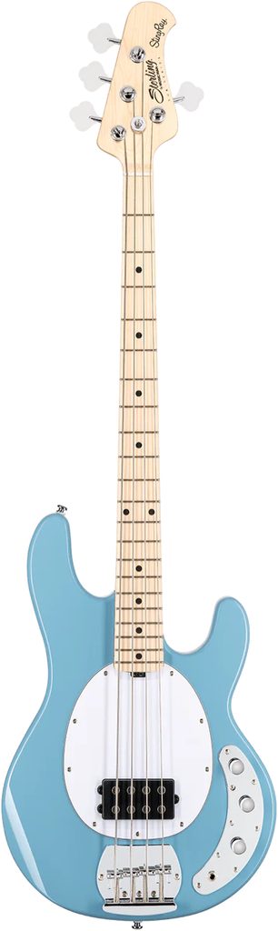 Sterling by MusicMan RAY4 v barvě Chopper Blue je cenově dostupná čtyřstrunná baskytara s ikonickým StingRay designem, keramickým humbuckerem a aktivní elektronikou. Nabízí silný, průrazný zvuk a moderní hratelnost pro začátečníky i pokročilé hráče.