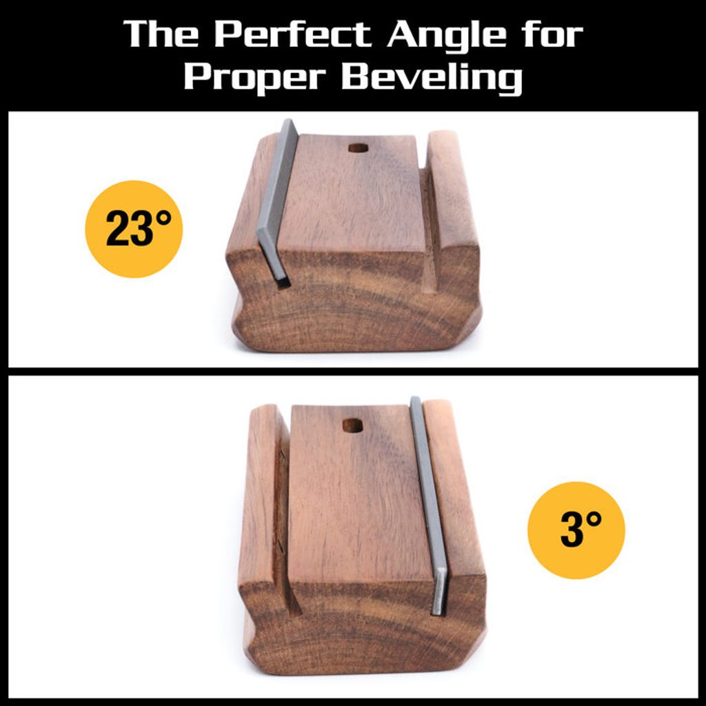 - 2 různé sloty pro uchycení pilníku pod úhlem 23° nebo 3° – 2 nejčastěji se vyskytující úhly zkosení