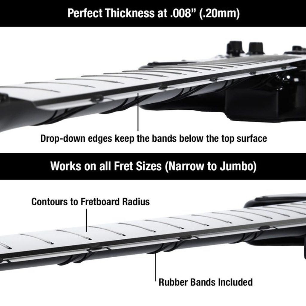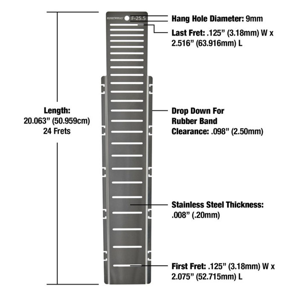 Je navržený pro nástroje s úhlopříčkou 25,5 palce, tedy na většinu modelů Fender, Taylor, Ibanez, Charvel, ESP, Jackson, Kramer, Schecter, PRS (Silver Sky) a Steinberger. .008-palcová konstrukce / 20mm / z nerezové oceli vydrží stovky lešticích prací a byla důkladně testována s výkonnými lešticími koly, silovými lešticími podložkami. Precizně zpracovaný povrch neobsahuje žádné otřepy ani hrany a má výjimečně hladký povrch. Tenká konstrukce umožňuje snadný dosah od základny krku po její konec. Sklopné hrany a přiložené gumičky pevně připevňují štít k hmatníku a zároveň přizpůsobují kov poloměru kytary. Lze použít pro velikosti pražců od úzkých pražců ve stylu vintage až po jumbo. Praktický otvor pro zavěšení na Vašem pracovním stole.