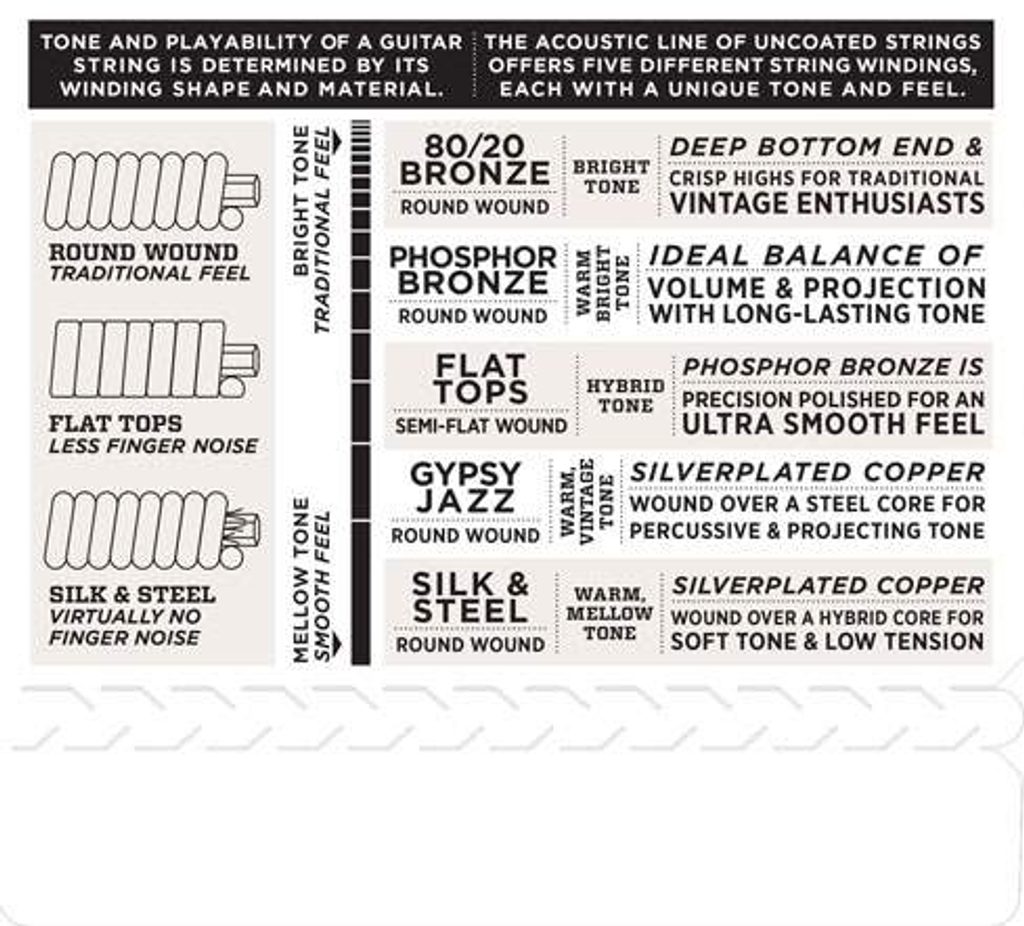 Struny z řady Phosphor Bronze Wound určené pro akustické nástroje byly představeny už roku 1974 a od té doby patří mezi ty nejoblíbenější mezi kytaristy a baskytaristy po celém světě. Jsou de facto synonymem pro teplý, ale jasný dobře vyvážený přirozený zvuk. Jejich vinutí je z korozi odolného fosforového bronzu, šestihranné jádro je pak tvořeno Ocelové s vysokým obsahem uhlíku. Nabízí tak dlouhou životnost, excelentní intonaci a nádherný tón.